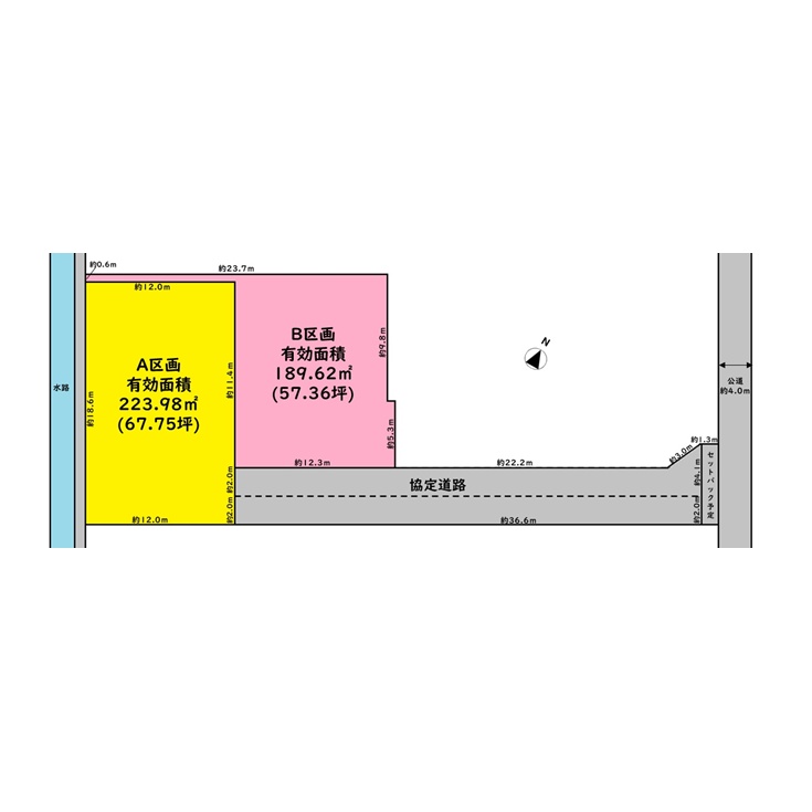 | 接道状況 | A区画:北東側約4.0m公道に約2.0m接道 B区画:北東側約4.0m公道に約4.1m接道 |